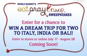 To celebrate the release of the upcoming film, Eat, Pray, Love on August 13, World Market is giving you a chance to win a trip for two to Italy, India, or Bali!