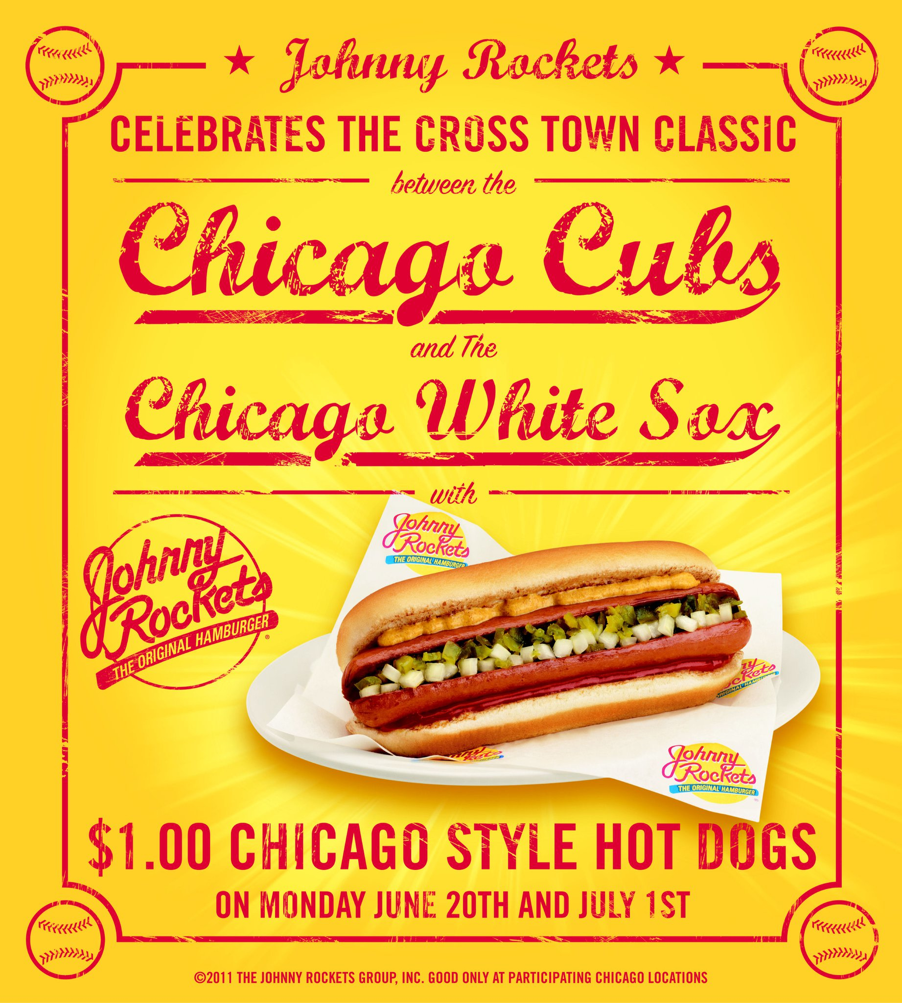 To ring in the Crosstown Classic, the Chicago Cubs® and Chicago White Sox® rivalry games, Johnny Rockets will celebrate with $1 Chicago Style Hot Dogs (reg. $2.49), no limit per person, on Monday, June 20 and Friday, July 1 at select Chicagoland locations.