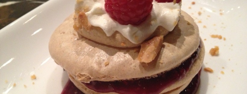Dacquoise with creamy peanut butter mousse, peanut meringue, raspberry jam and salted peanut brittle.