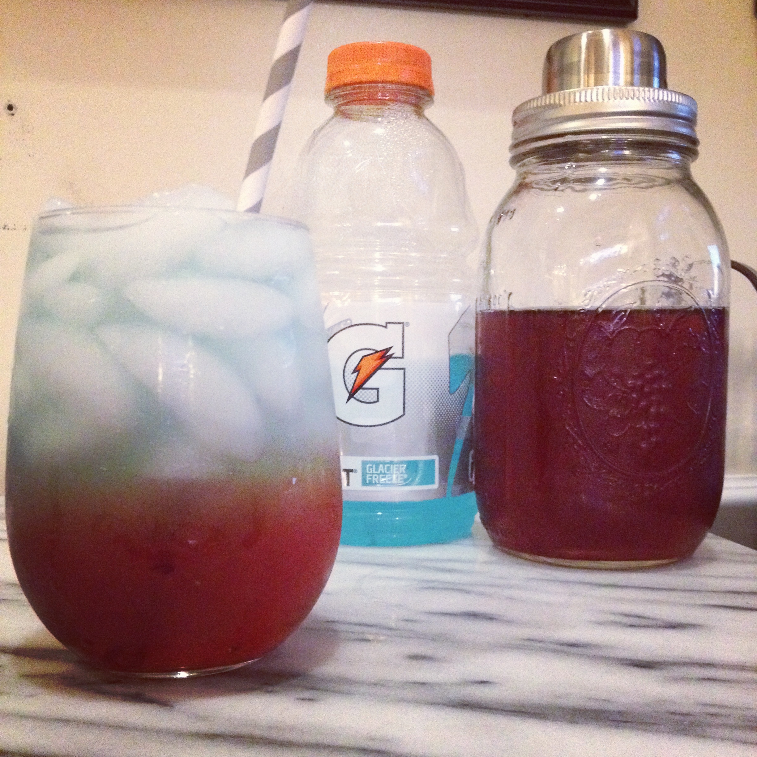 The key to this drink is the sugar levels. The more sugary drink will stay on the bottom and drink with less sugar will float to the top. Mix your alcohol in the red layer so the extra sugar will help keep it at the bottom. With the ice included, you’ll get the red, white and blue layered effect!