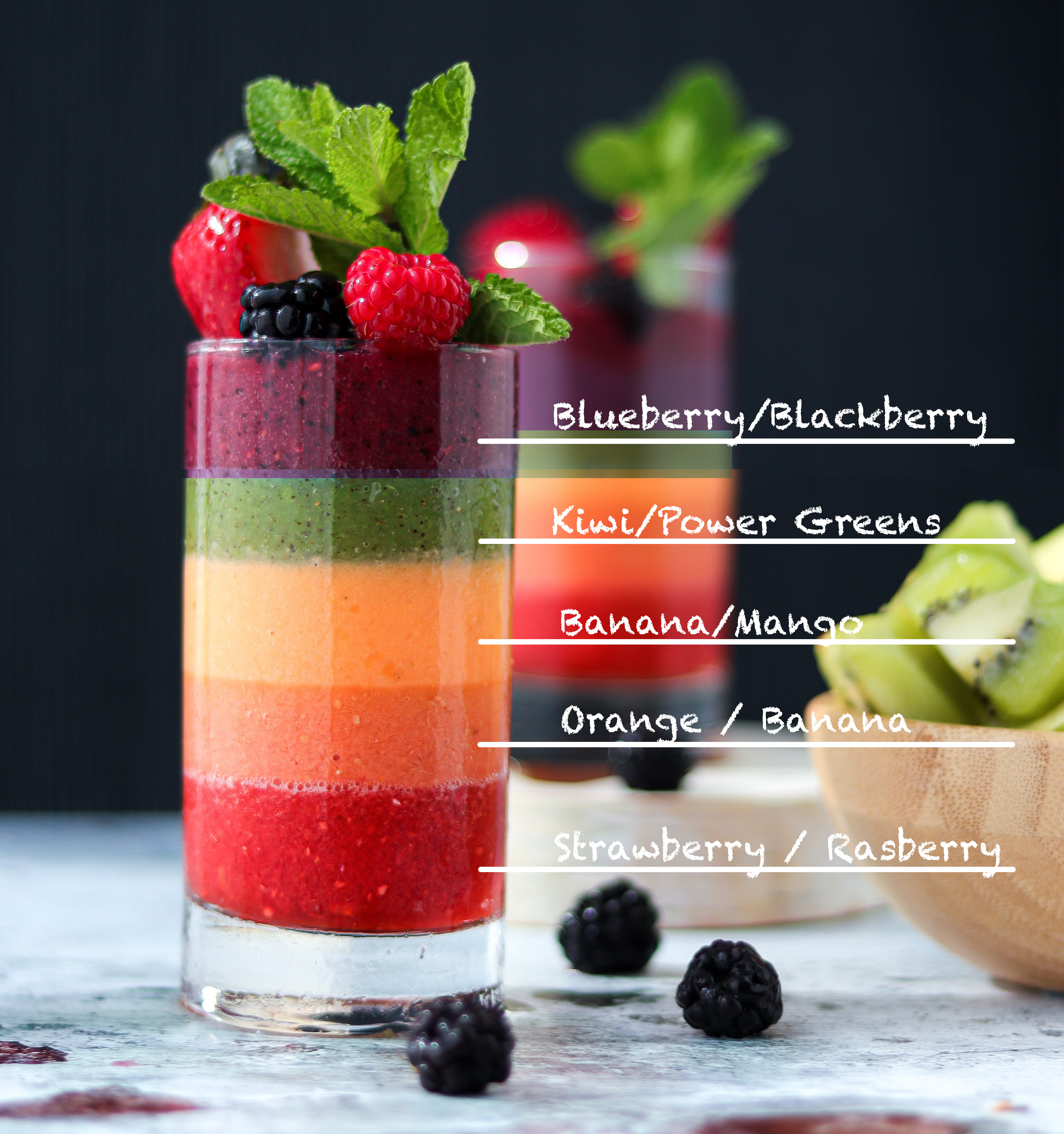 Whether you’re looking for a St. Patrick’s day rainbow treat or a rainbow dessert for a birthday party or celebration, the rainbow smoothie is always a hit! We’ll show you how to get the perfect rainbow layers every time. This visually beautiful smoothie also tastes like a rainbow! You’ll taste the different fruit in each rainbow layer.