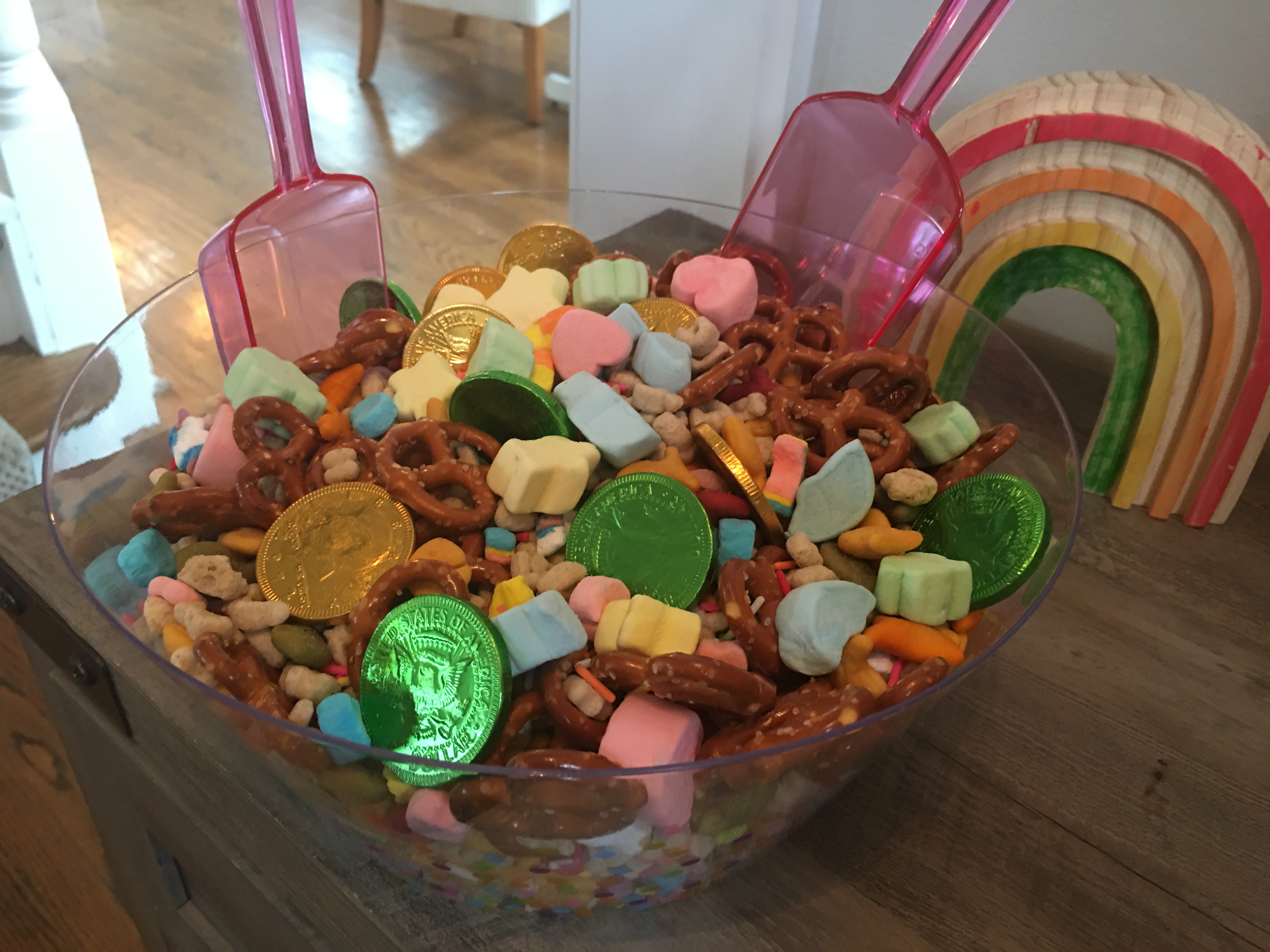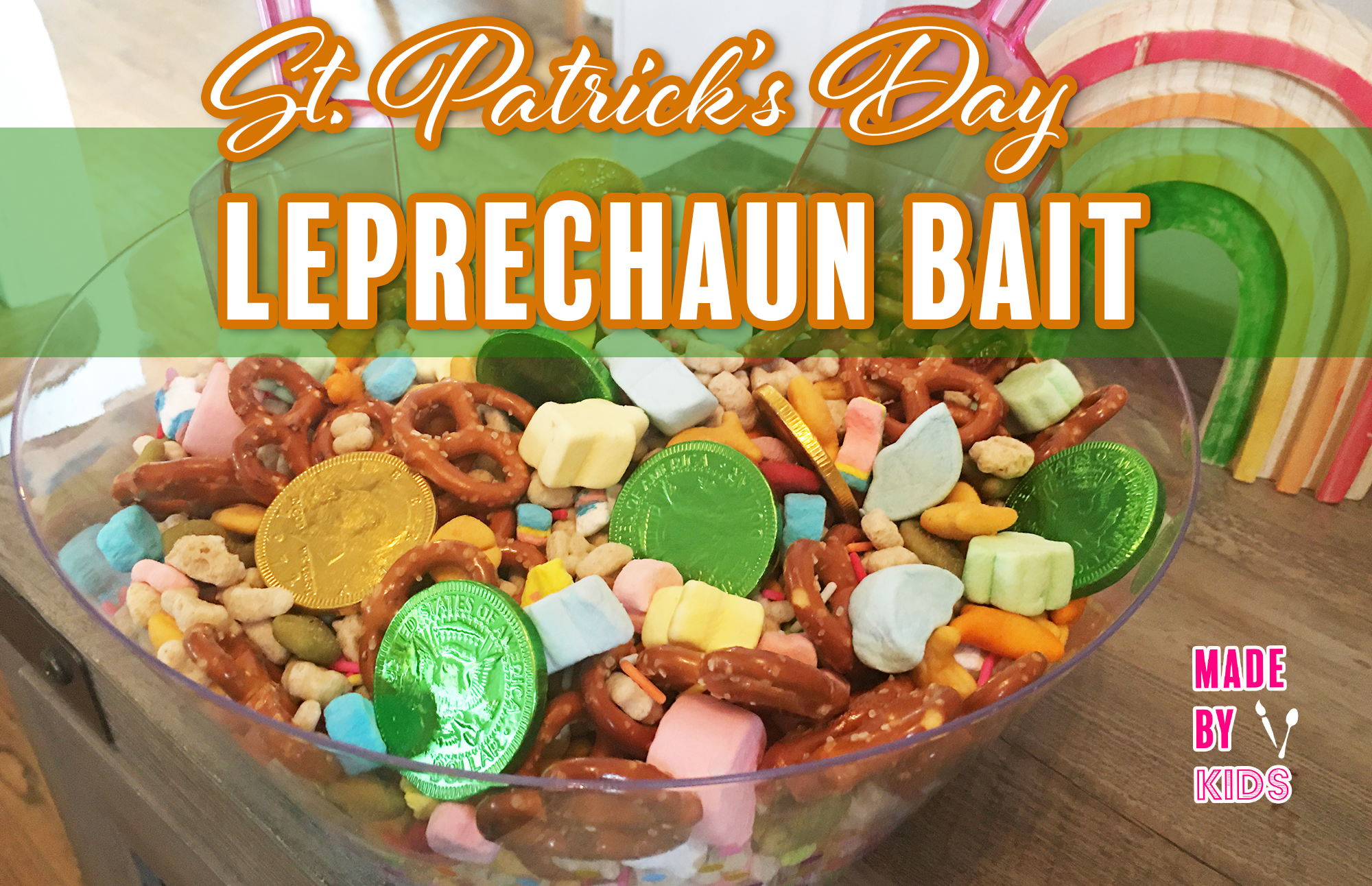 For St. Patrick’s Day 2023, we’re making leprechaun bait! You’ll catch a leprechaun and the heart of your guests with this super easy St. Patrick’s Day treat. This leprechaun bait is an easy and delicious St. Patrick’s Day trail mix. This leprechaun bait is also nut-free! With only 6 ingredients (Lucky Charms cereal, Lucky Charms marshmallows, rainbow Goldfish, mini pretzels, and chocolate coins this St. Patrick’s Day recipe only takes minutes to mix together. This leprechaun bait recipe is also a fun St. Patrick’s Day craft for kids. Let them help pour in the ingredients and make their own creation.