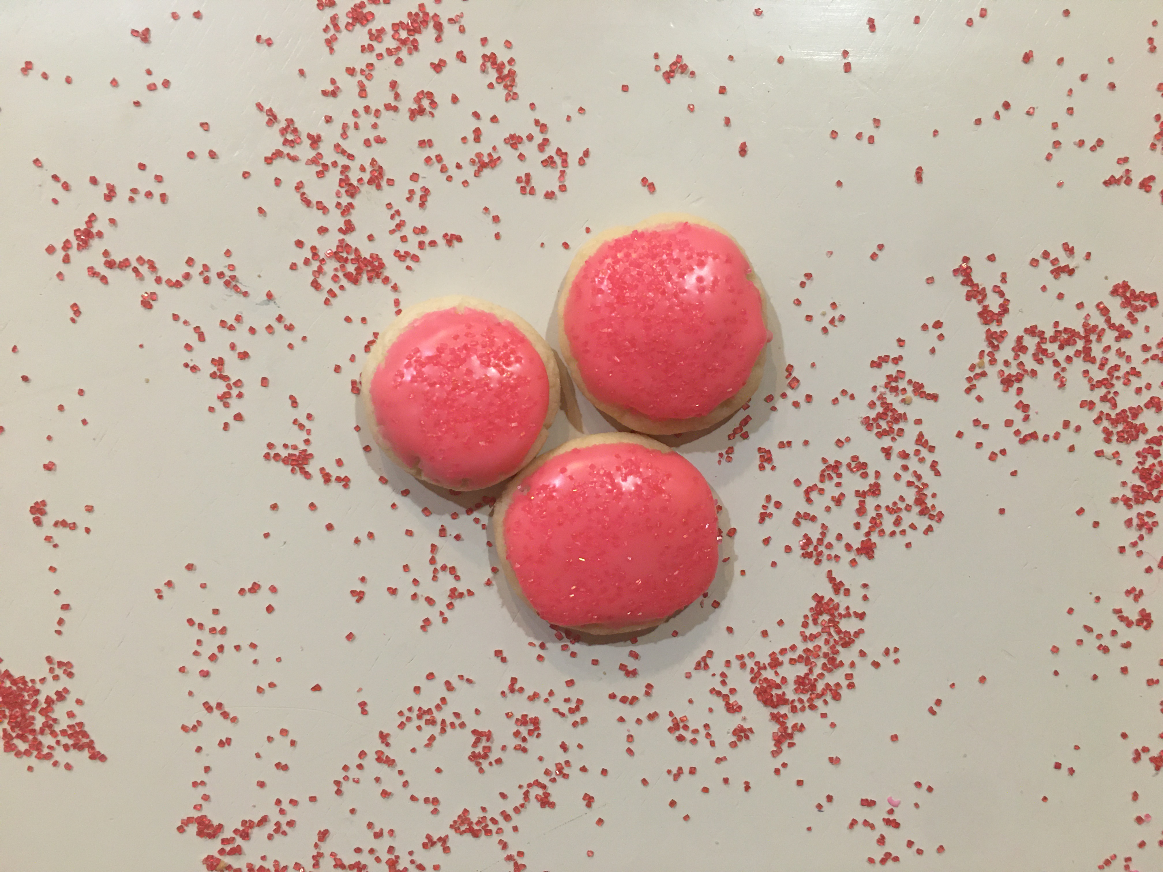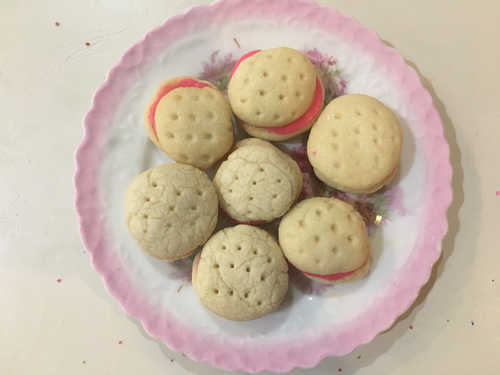 To make mini-sugar cookies, follow the recipe instructions above. Your small dough ball will be about the size of a quarter. Flatten and use a fork to add indents to the top. Once the cookies are cool, place icing in the middle and make a sandwich with two cookies together.