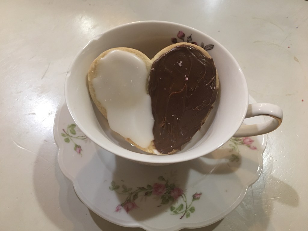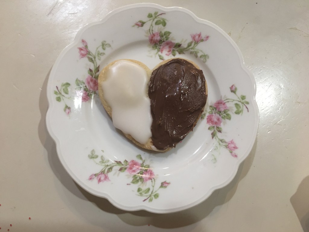Bake sugar cookie as instructed above. Once the cookie is cool, add white icing to half of the heart. On the other half, we used Nutella for the black side. You can also use icing with black food coloring or melt dark chocolate.