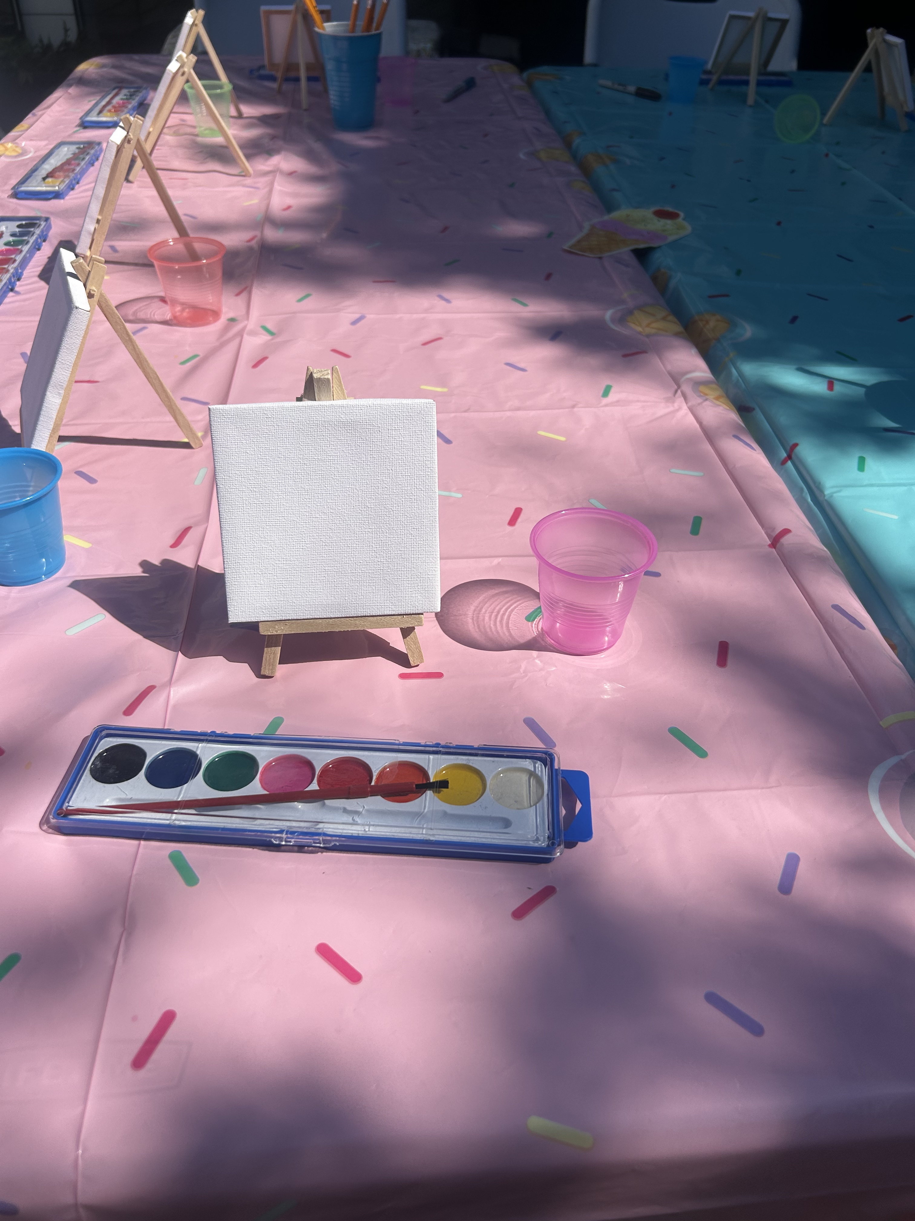 We used mini canvas, easels, and water color paints and had the kids paint a mini ice cream cone. They could then add real sprinkles and we used clear glue and a paint brush to keep the sprinkles on the canvas.