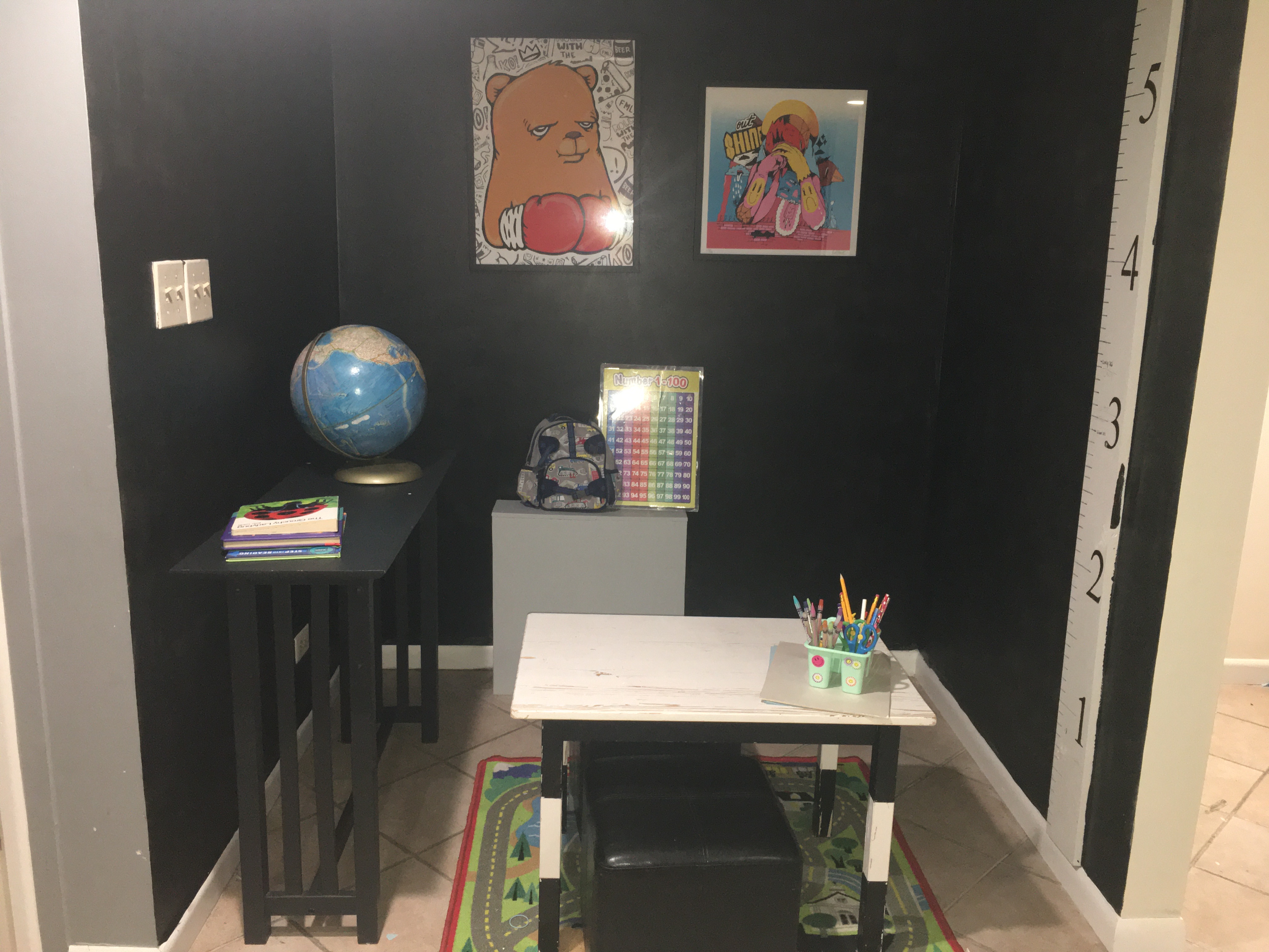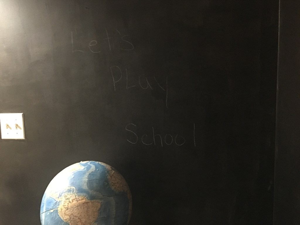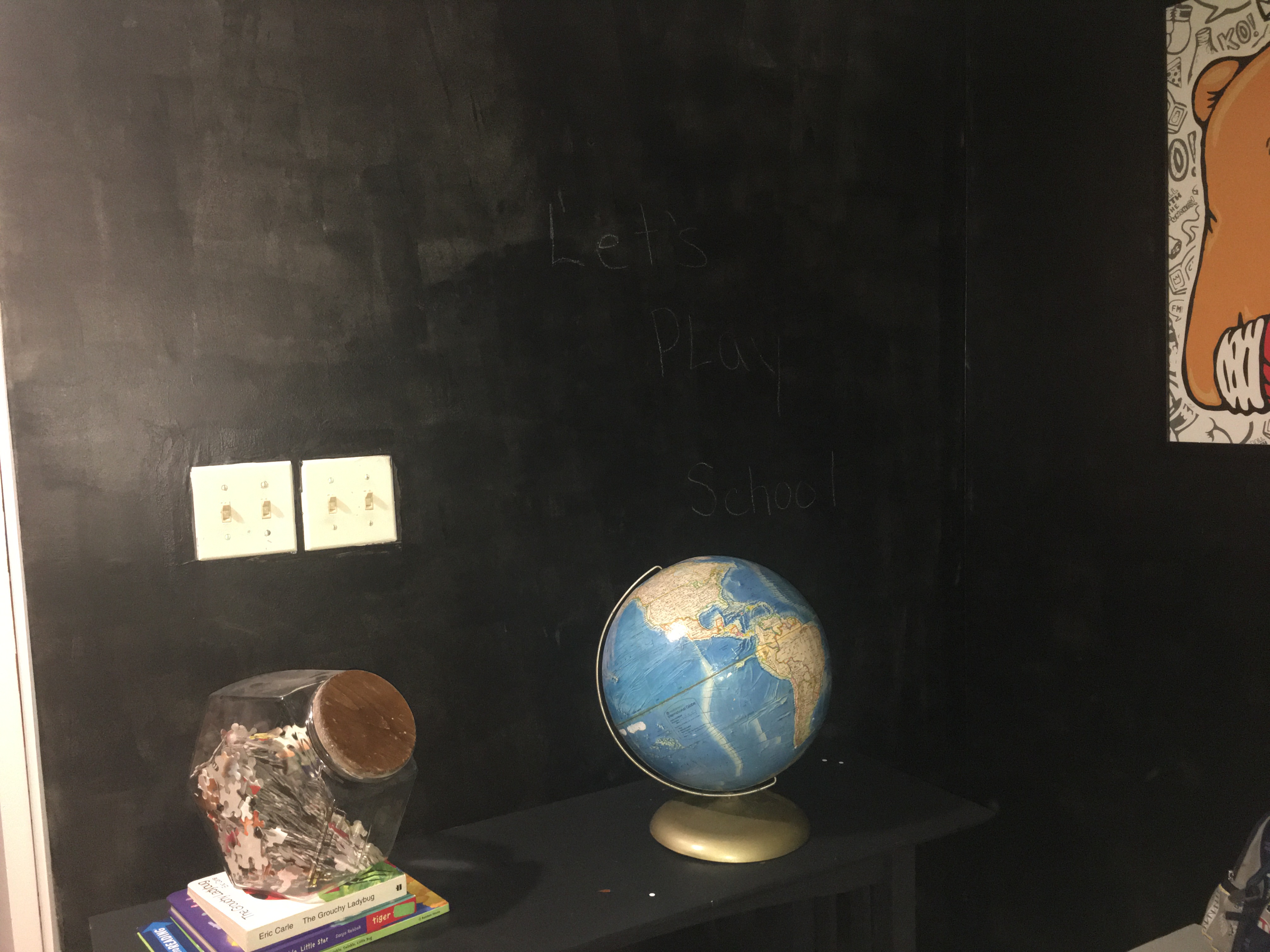 We have a little nook in the basement that’s pretty small. We will likely do a storage solution in it one day For now, the kids voted for mini-play school. I used Rustoleum Chalkboard Paint, a table, stools, and a globe we already had to set it up. The only cost here was the paint but it’s a fun new way to use an unused space.