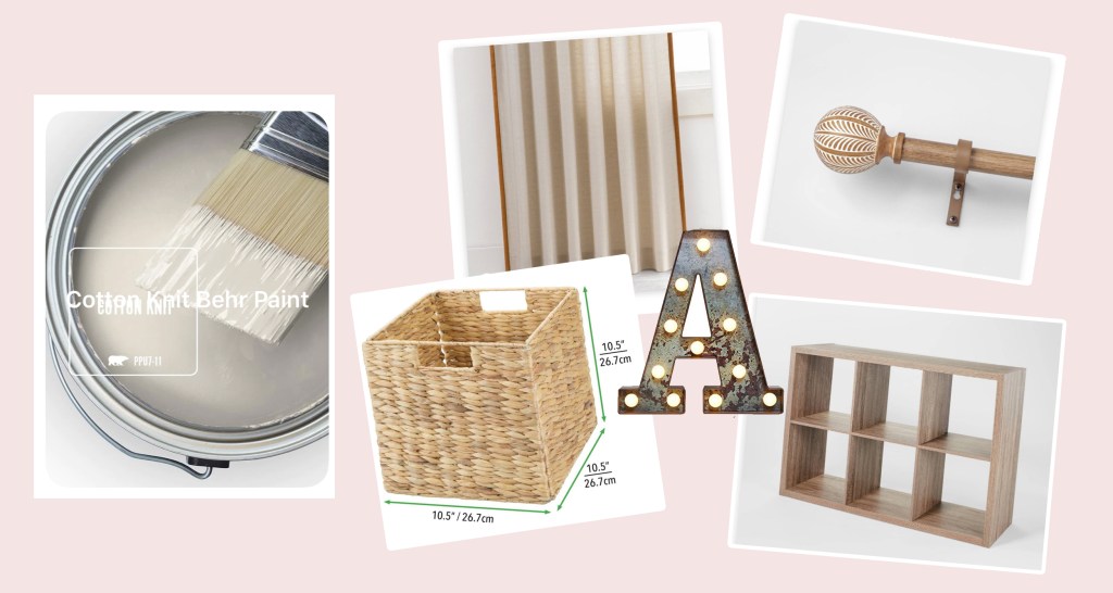 We already had these six-cube storage organizers (@Amazon) in weathered gray. I also had a set of square wicker baskets @Amazon that go inside. We made a pact to only keep toys that would fit inside these baskets. We used what we already have to organize each basket by theme. A couple of their favorite larger items sit on top and the rest of the floor space is now open to play.