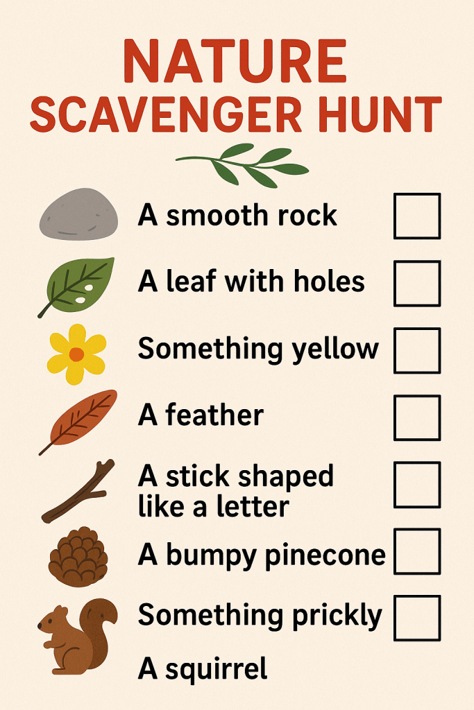 Hereโs a fun and simple Nature Scavenger Hunt you can use with kids. Itโs easy to follow and works for backyards, parks, or even a walk around the neighborhood.
