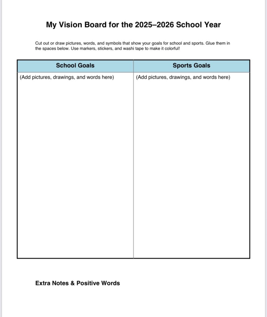 A vision board is a fun, hands-on project that allows kids to picture what they want to achieveโboth in the classroom and on the field or court. For the 2025โ2026 school year, it can be a creative tool to help your child set intentions, stay motivated, and visualize success in school and sports.
