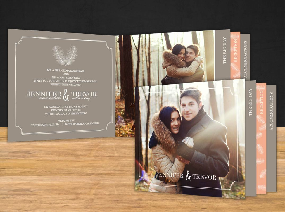 With soft feather accents, elegant white fonts, and simple white borders, this booklet wedding invitation will add grace and charm to any happy couple’s big day. The delicate feather accents and peachy pink tones will add a splash of summer flavor to your photos and wedding details.