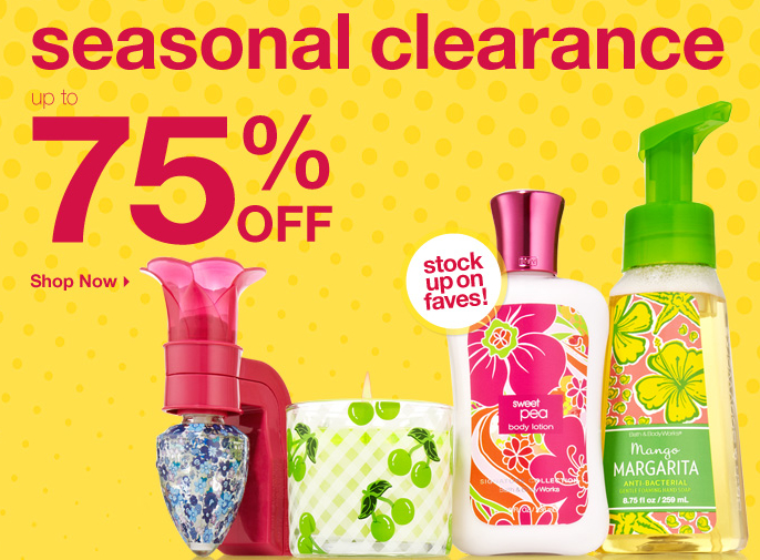 Prior to tax and shipping and handling. While supplies last. No substitutions. Selection may vary online and by store location. Offer not redeemable for cash or gift cards, nor is it valid on previous purchases. Exclusions and/or purchase limitations may apply. Up to 75% off seasonal clearance offer valid at U.S. Bath & Body Works stores and BathandBodyWorks.com through 11:59 p.m. EST on July 3, 2011 or when supplies run out. Offer not valid at Bath & Body Works stores in Canada and Bath & Body Works outlet locations.