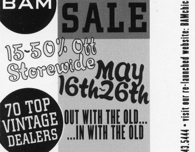 It happens only once a year: Broadway Antique Market’s Atomic Summer Sale* – Friday, May 22nd thru Sunday, May 31st. Chicago’s Antique Department Store, Featuring 75 Top Dealers on 2 Giant Levels— Art Deco through Mid Century Modern, 60’s 70’s. Thousands of Items, Discounted 15% to 50% Off Storewide. 6130 N. Broadway, Chicago, IL. 773-743-5444. BamChicago.com. Open Daily, 11 to 7.