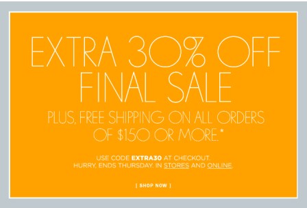 J.Crew 30% off coupon, plus FREE shipping! Ends tomorrow! August 18, 2010Leave a comment Shopย jcrew.com or in stores! Clickย here for Chicagoland locations. Use Code: EXTRA30ย at checkout Share this: Click to share on Pinterest (Opens in new window) Pinterest Click to share on Facebook (Opens in new window) Facebook Click to share on X (Opens in new window) X Click to share on Tumblr (Opens in new window) Tumblr Click to email a link to a friend (Opens in new window) Email More Click to share on Reddit (Opens in new window) Reddit Click to print (Opens in new window) Print Like Loading...
