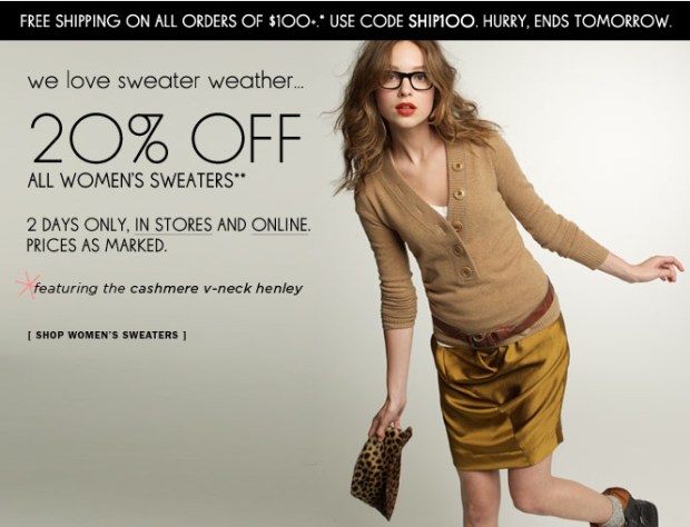 J.Crew – 20% OFF all women’s sweaters & FREE SHIPPING September 14, 2010Leave a comment Two days only! Shopย jcrew.com or in stores! Clickย here for Chicagoland locations. Share this: Click to share on Pinterest (Opens in new window) Pinterest Click to share on Facebook (Opens in new window) Facebook Click to share on X (Opens in new window) X Click to share on Tumblr (Opens in new window) Tumblr Click to email a link to a friend (Opens in new window) Email More Click to share on Reddit (Opens in new window) Reddit Click to print (Opens in new window) Print Like Loading...